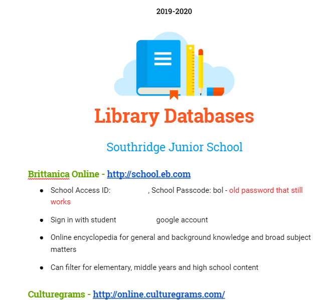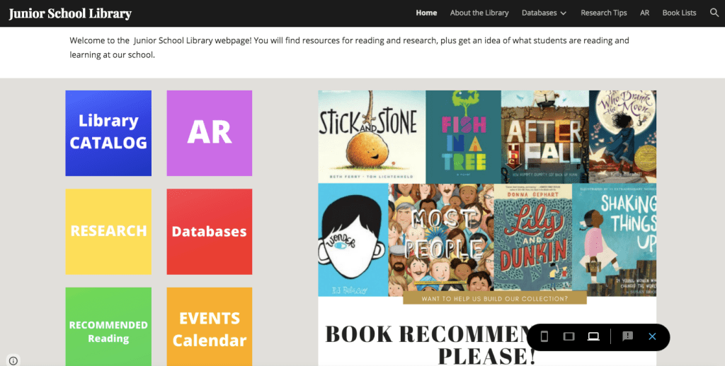 Before sharing this post and my website, I wanted to meet with the Marketing and Communications Team and update everyone on my battle with this department. I met with our Vice Principal of Curriculum earlier this week to show her the website design, knowing she would love it and find it to be a wonderful resource. In that moment, we both realized that we needed to reframe what this creation actually was. It is a helpful collection of every library resource available and it is directly tied to supporting student learning. We prepared for a follow up meeting with the Marcom director today by removing the word “website” from our vocabulary. I’m happy to report that our meeting went very successfully! This “library website” is now known as a Library Resource Page. We explained how it is akin to all the other learning documents I send out, except that it’s better organized and all the information is centralized in one document link. Somehow this explanation brought both us educators and the marketing/business side of our school to a common understanding. The Marcom department even offered to redesign the banners of the resource page so it looks more aligned and seamless with the school’s branding. I couldn’t have asked for a better result. Now I can share the link with the students, parents, and teachers and truly make this a resource for EVERYONE. I am incredibly excited! It feels like my hard work in creating the website and in advocacy has paid off.
